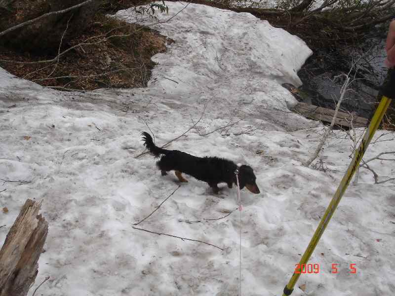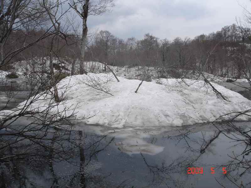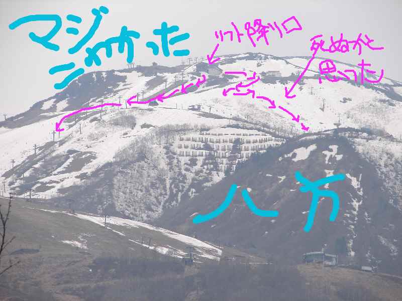 板を脱がずにいたのは、板を持って降りて、もし板が流れたらすげえ迷惑、事故になっちゃうし、そもそもスキー靴でこのぐずぐずの山山のゲレンデ歩いたら、埋まる…と思ったから。