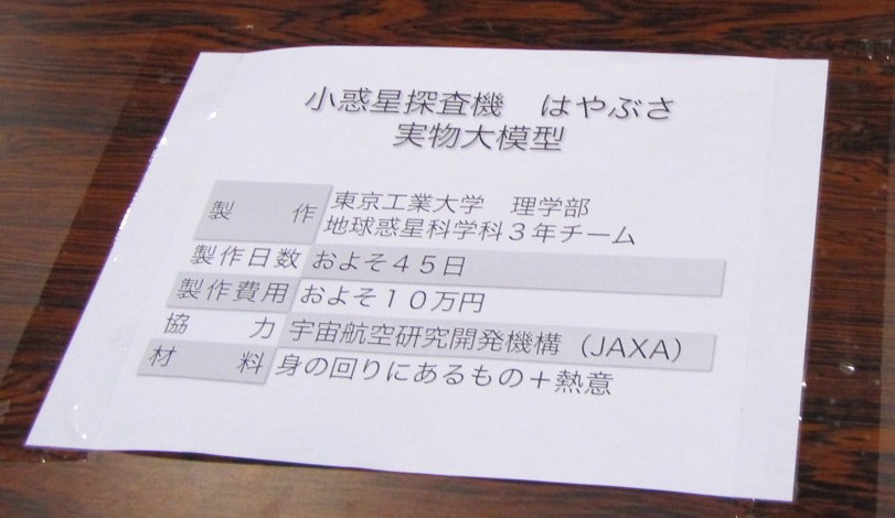 さて、はやぶさ実物大模型が置いてありましたが、