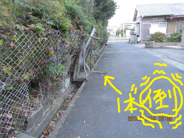 猫小路、大きく傾いたフェンス、を支えていた棒…