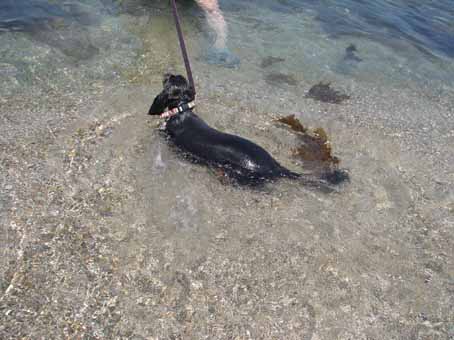 ムンクは飼い主につき合わされ、海の中へ。