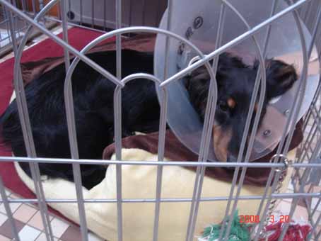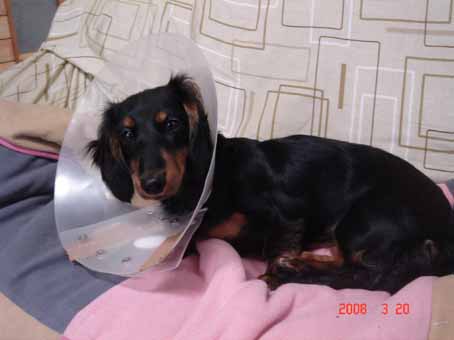 糸は、ダックスは炎症を起こしやすいので、少し特殊な糸で縫い、皮膚のほうは糸では無くホッチキスで止めてあること。そのほうが表面だけに穴が空いているので、外のばい菌が仲間ではいることが少ないことなど、説明してくれました。