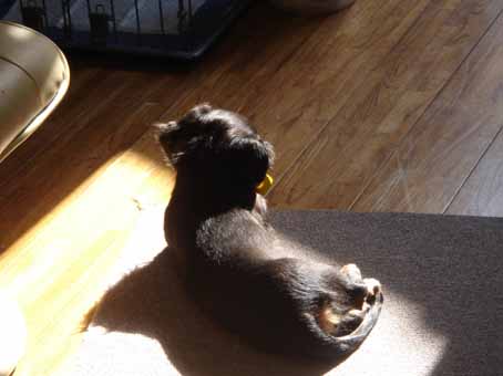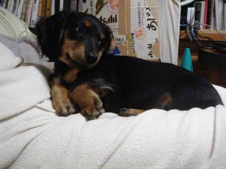 本人(犬)は、今後ろで、ダンボールを掘ろうとしていますよ、必死で…。