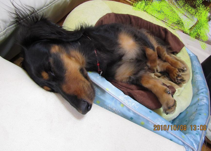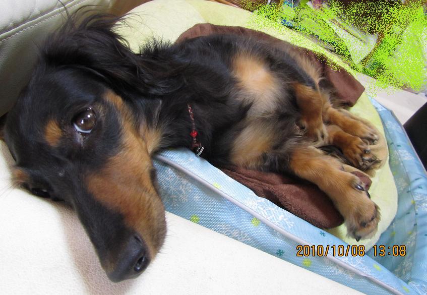 頭はソファーの段差を緩めるための犬用階段マットに乗せています。