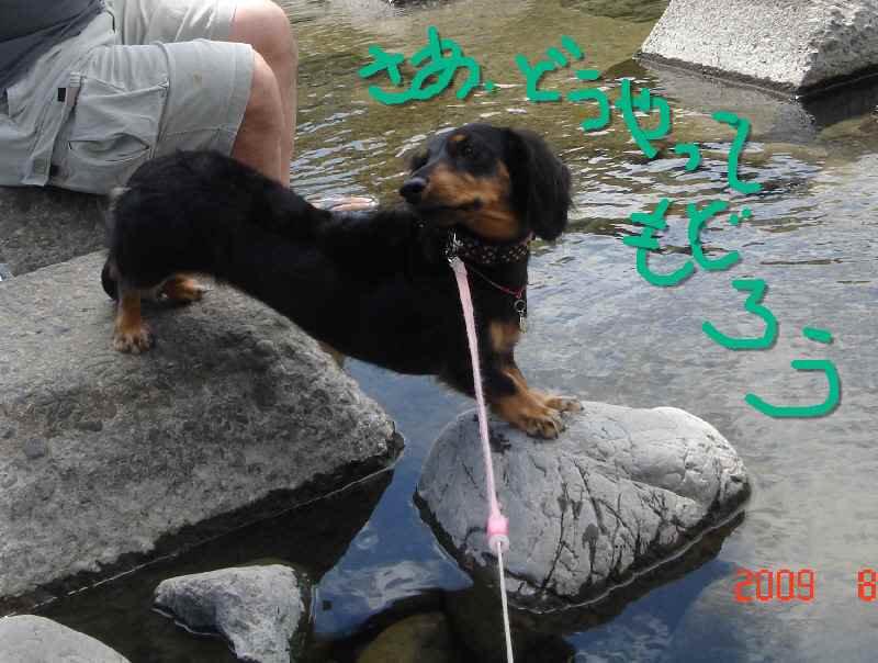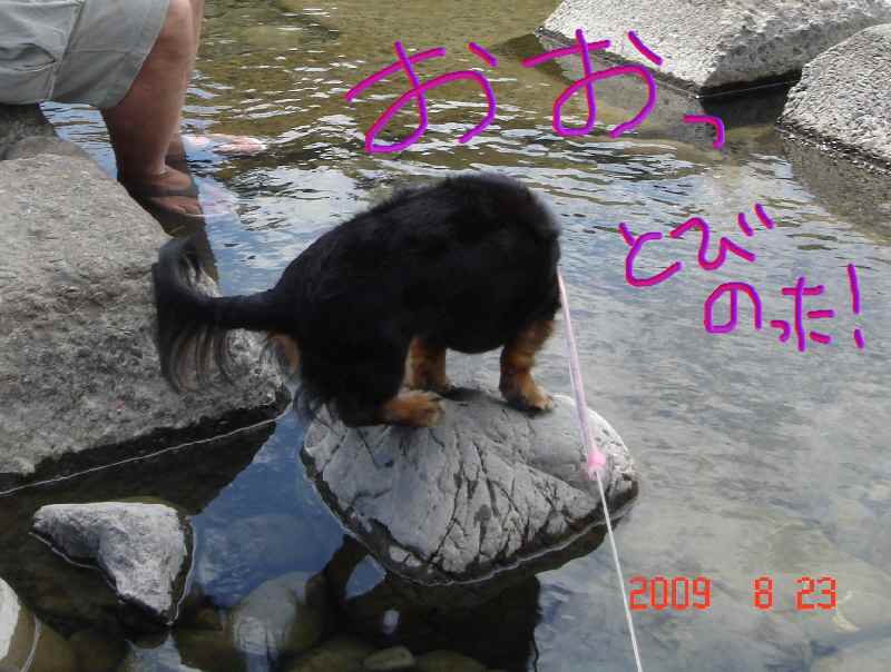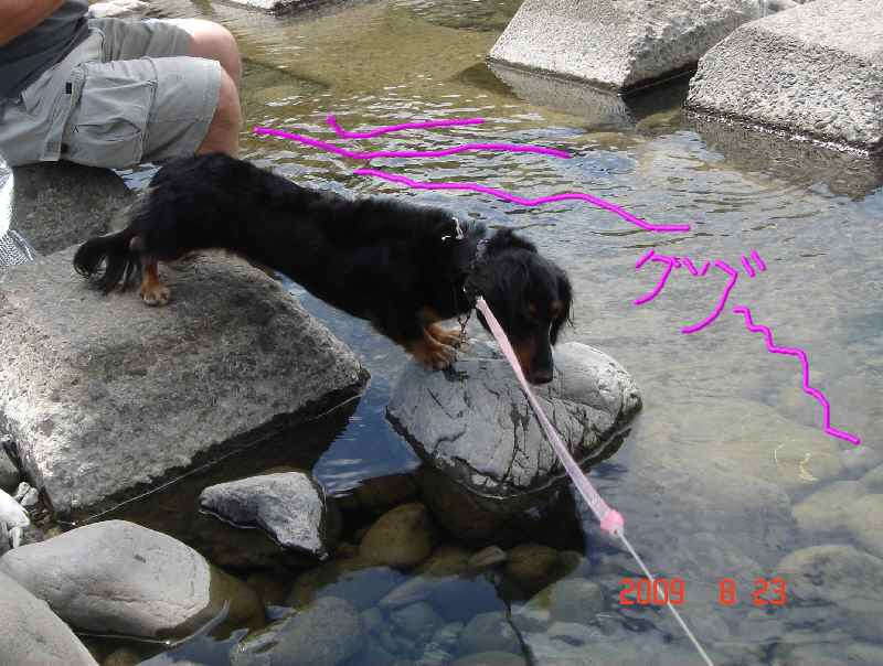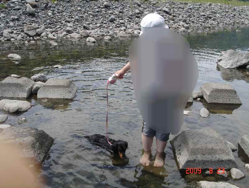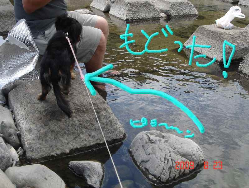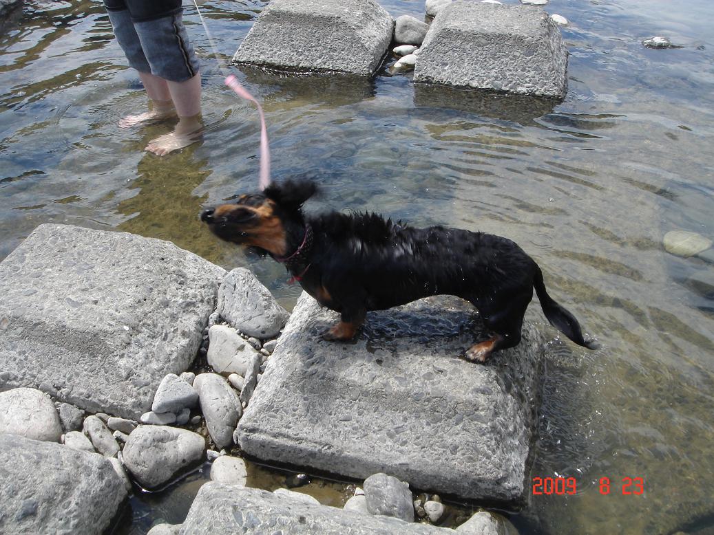 最後にセンセイが深い所に入れたところ、飼い主のいる方向は関係なく、着実に陸に向かって犬かきし、あっというまに陸にあがりました(爆)!