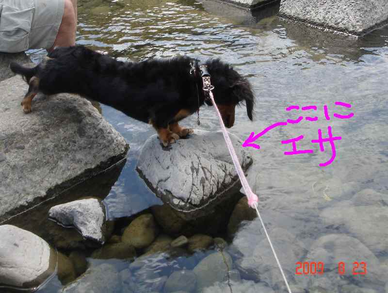 センセイ、飛び石の上に餌を置きました。